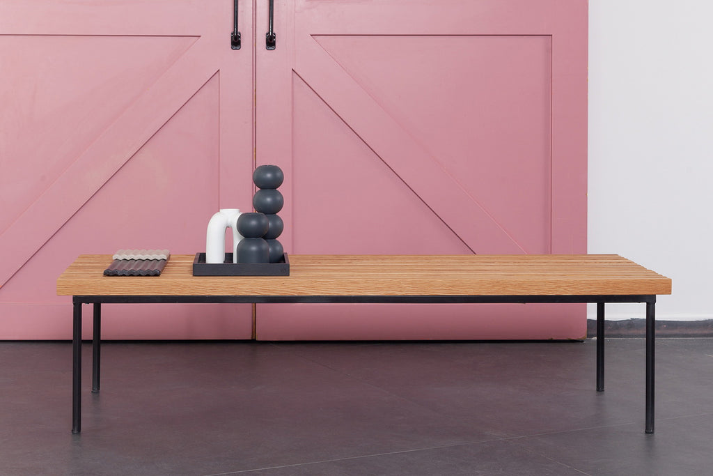 פשטות, סטייל והרמוניה טבעית – הכל מתמזג בשולחן אחד , שולן עץ אלון בבסיס ברזל מגולבן.