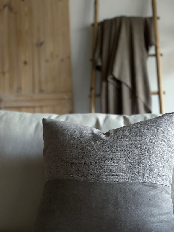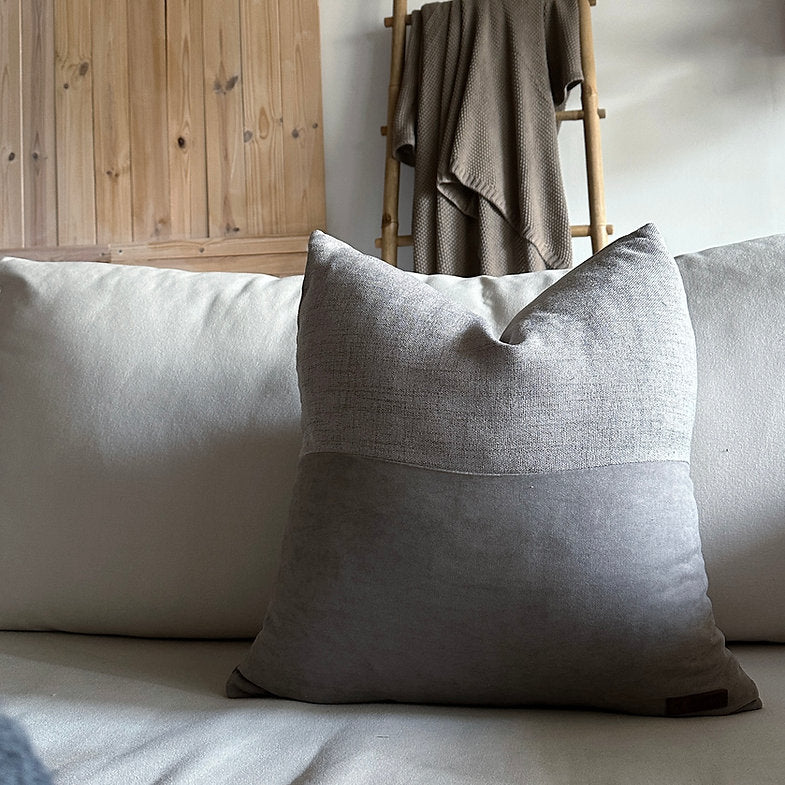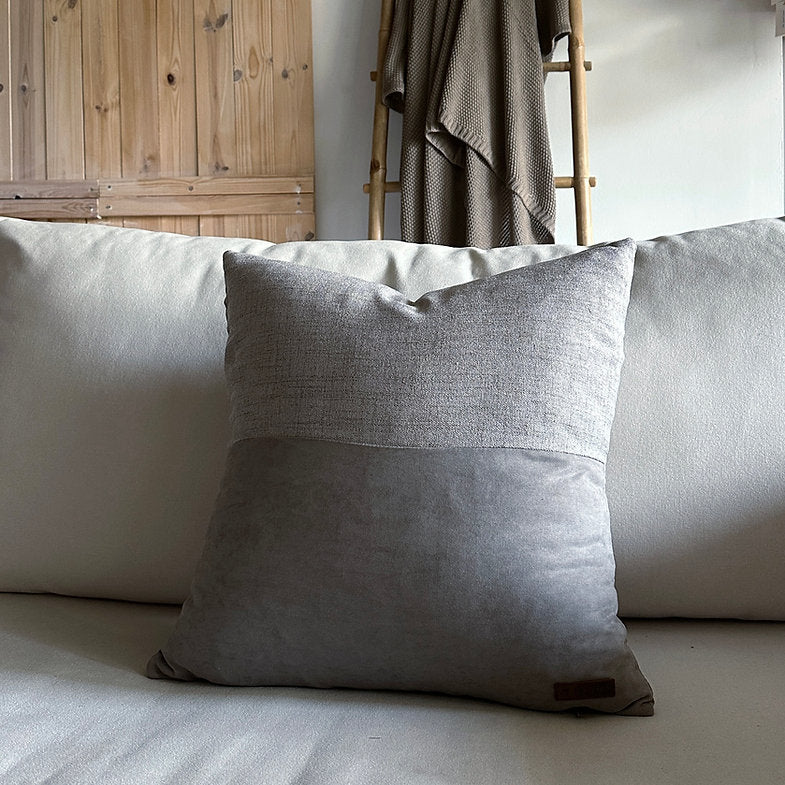 כרית נוי בשילוב שני סוגי בדים בעיצוב "חצי חצי" זהה משני צידיה.