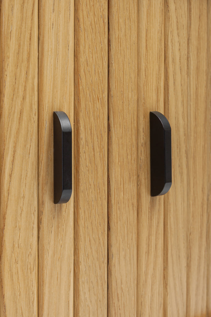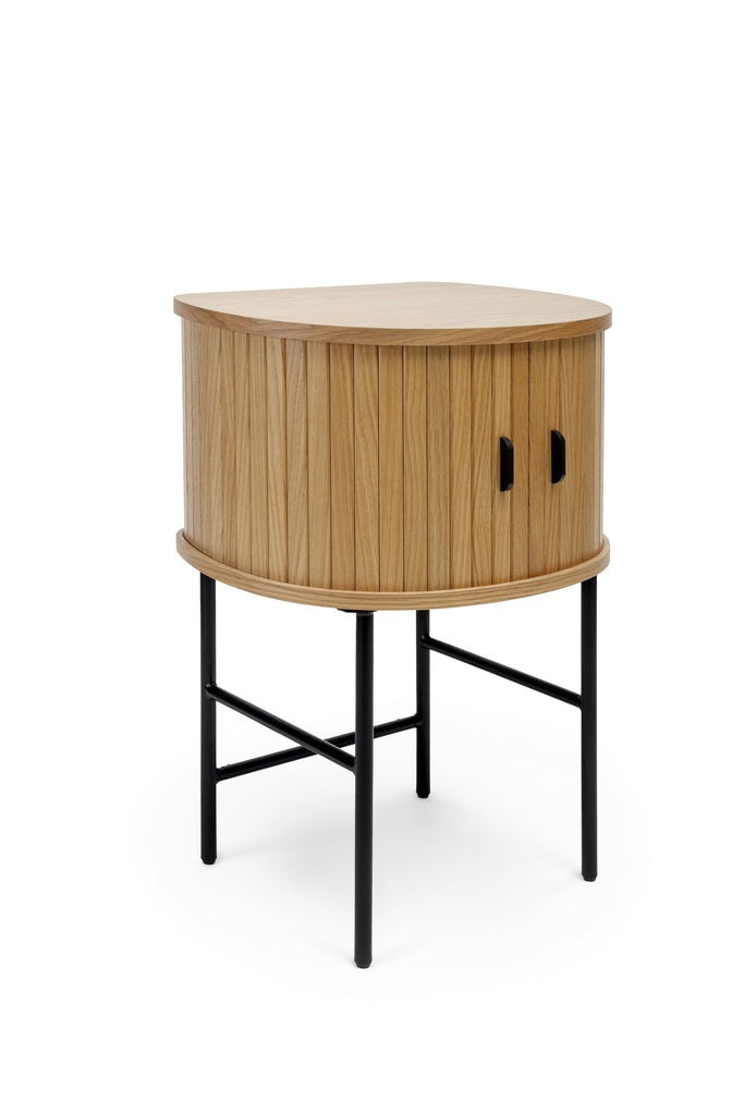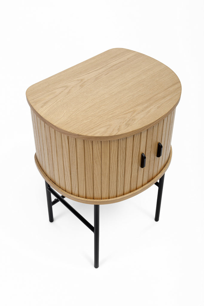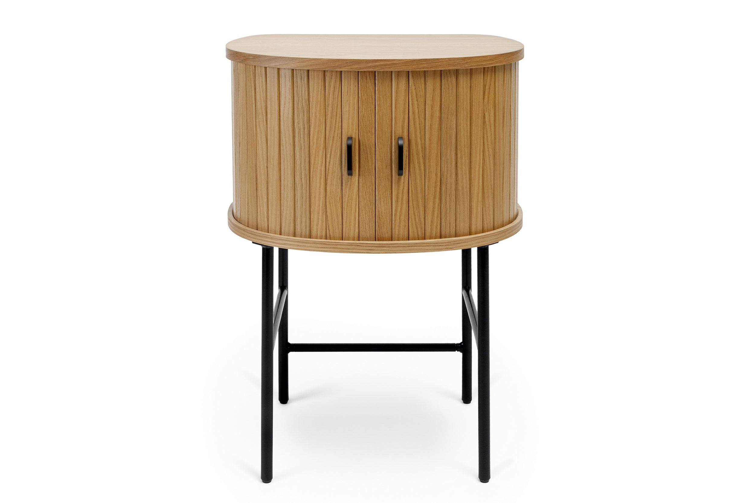 שידת לילה אלגנטית עשויה מעץ אלון טבעי בסגנון סקנדינבי. רגלי המתכת השחורות מדגישות את הקו הנקי והקליל של העיצוב, ומאחורי הדלתות מסתתר תא אחסון נוח עם מדף. שילוב מושלם בין סגנון לפרקטיות לחדר השינה שלכם. בזכות העיצוב האוניברסלי, השידה מתאימה בקלות גם לחללים מודרניים וגם לקלאסיים.